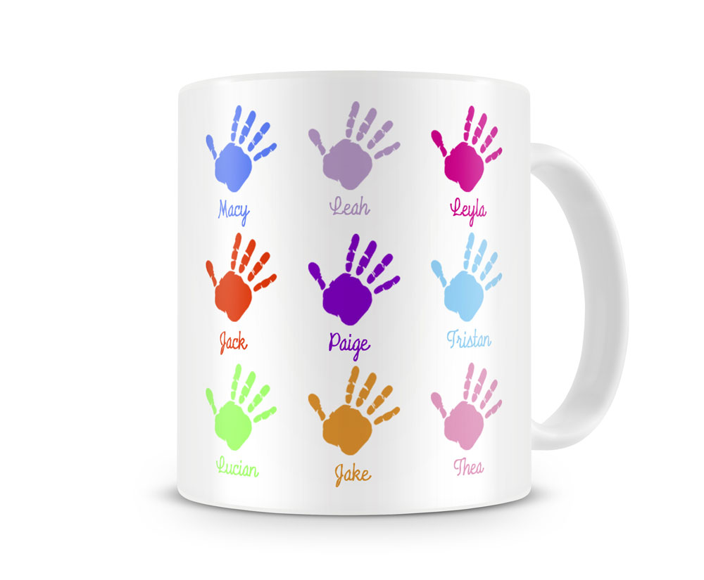 | Why not treat your mum to the mug she deserves. On the reverse of each mug we can print up to 9 hands with a child's name under each hand Just £11.99 including UK delivery |